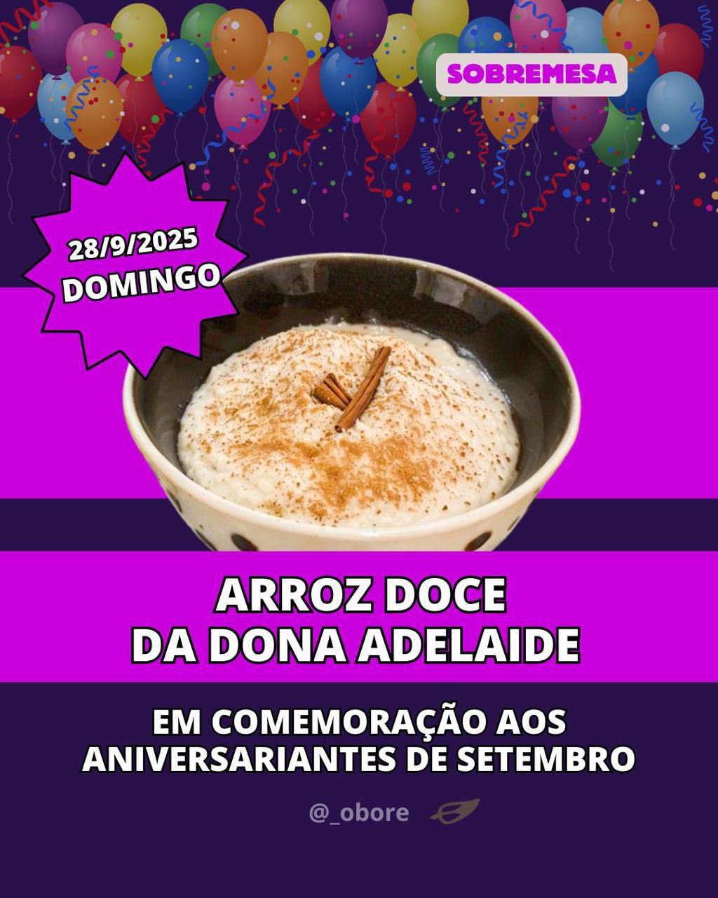A novidade da edição é a sobremesa: arroz-doce de Dona Adelaide, mãe de Sergio e Fernando Gomes, falecida recentemente aos 102 anos. O doce será uma homenagem aos nascidos em setembro: além de D. Paulo Evaristo Arns, Paulo Markun, Ricardo de Moraes Monteiro, Celso Napolitano, bem como Fernando e Sergio Gomes. Segundo este último, jornalista idealizador do projeto, a lista pode aumentar e desde já está aberta para outros frequentadores.