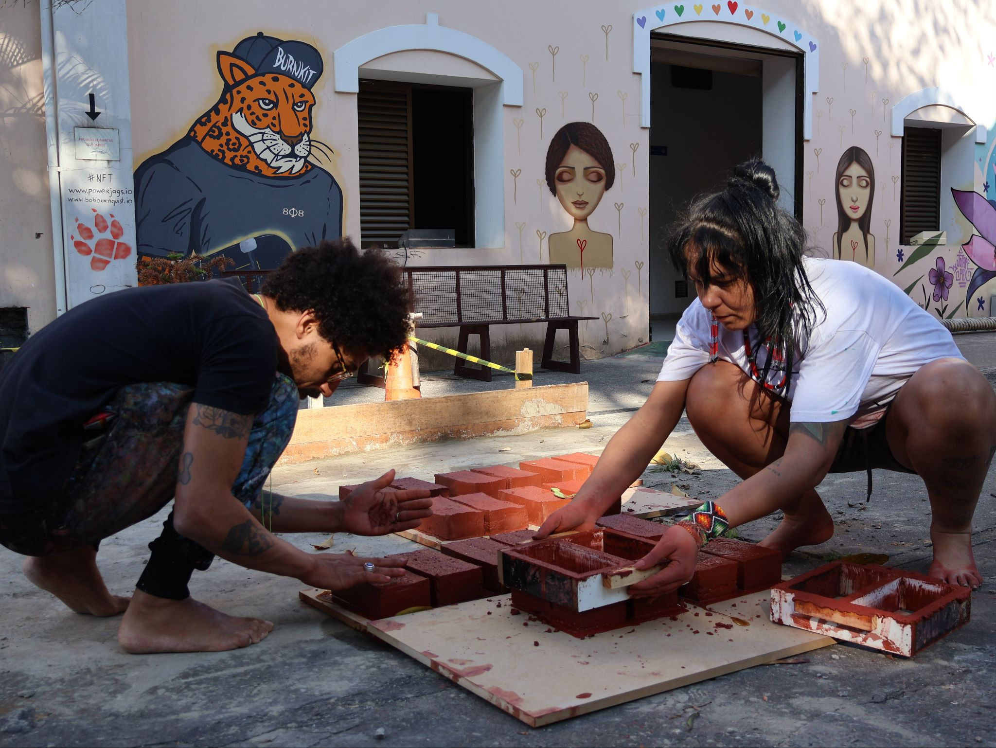 Os artistas Kleber Pagu e Cassis Guarniçara durante confecção dos tijolos. Foto: Frank Oliveira