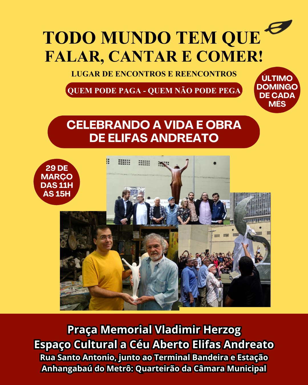 No próximo dia 29 de março, a partir das 11h, a Praça Vladimir Herzog (atrás da Câmara Municipal de São Paulo, no bairro da Bela Vista) abrigará mais uma edição do evento “Todo mundo tem que falar, cantar e comer”, desta vez em comemoração antecipada ao Dia do Jornalista (7/4) e homenagem ao artista plástico Elifas Andreato, que faleceu na data há quatro anos e dá nome ao espaço cultural a céu aberto ali instalado, com várias obras de sua autoria.
