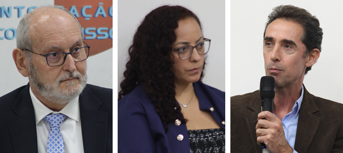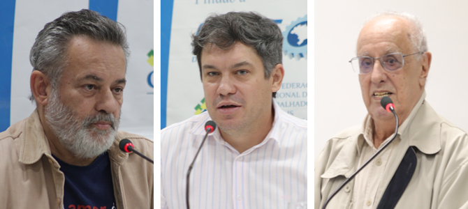 Da esquerda para a direita, João Franzin, Fernando de Lima e João Guilherme Vargas Netto.Segundo ele, no mundo globalizado, o conflito no Oriente Médio pode vir a interferir na inflação no Brasil, sobretudo no que concerne ao aumento do preço do petróleo, mas isso ainda não ocorreu. Pelo contrário, conforme sua análise, a projeção é de expansão econômica nacional tanto em 2026 quanto em 2027. Para o ano vigente, a expectativa é de crescimento de 1,8%.