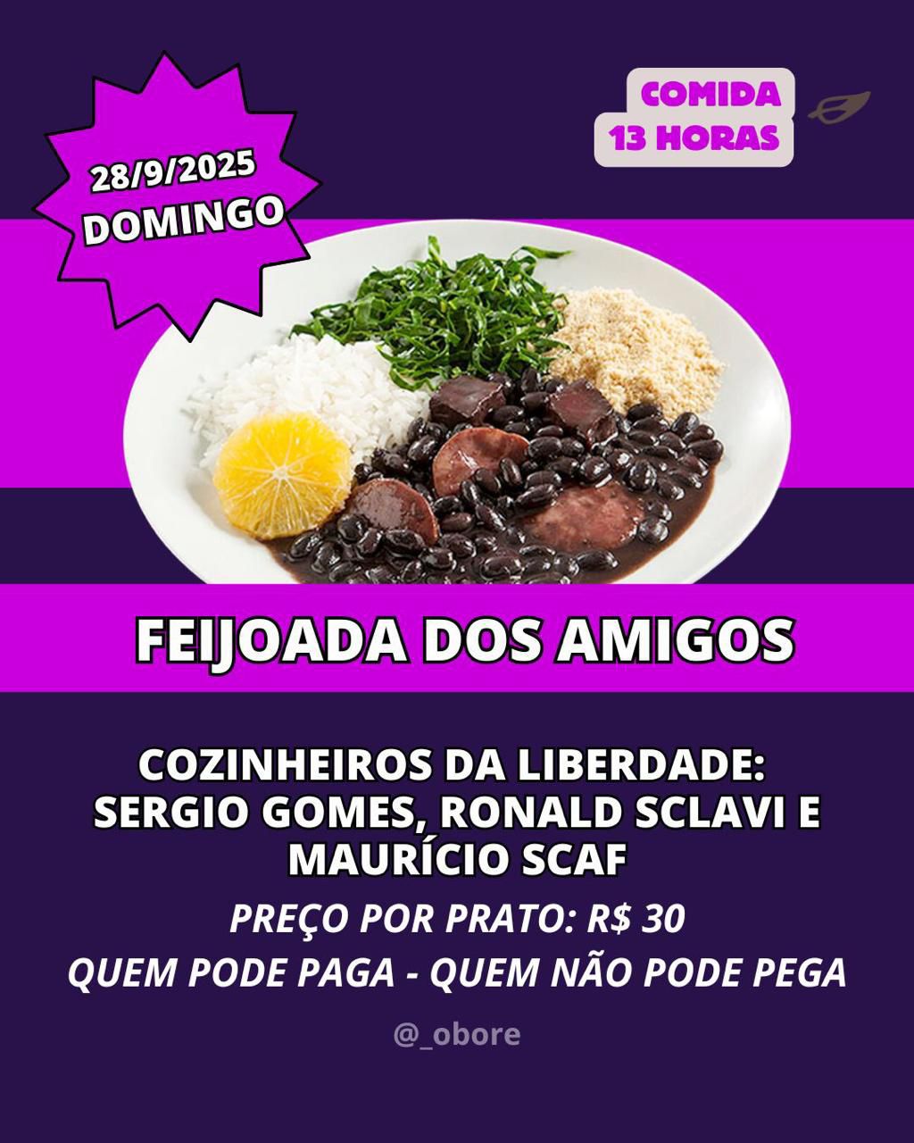 A mesa será posta às 13 horas, e a contribuição pelo prato é voluntária, obedecendo à regra essencial do evento: “Quem pode paga, quem não pode pega”. O valor sugerido é de R$ 30,00, e a arrecadação será inteiramente direcionada a cobrir os gastos com a iniciativa.