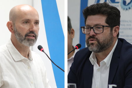 Rodrigo Vaz e Alberto Oliveira (à direita).Oliveira, que é também procurador do trabalho, salientou, diante das mudanças impostas a partir de sua aprovação em 2017, a importância de efetivamente se incentivar nas negociações a inclusão nos acordos e convenções coletivas de trabalho da contribuição assistencial/negocial para garantir essas fontes de custeio.
